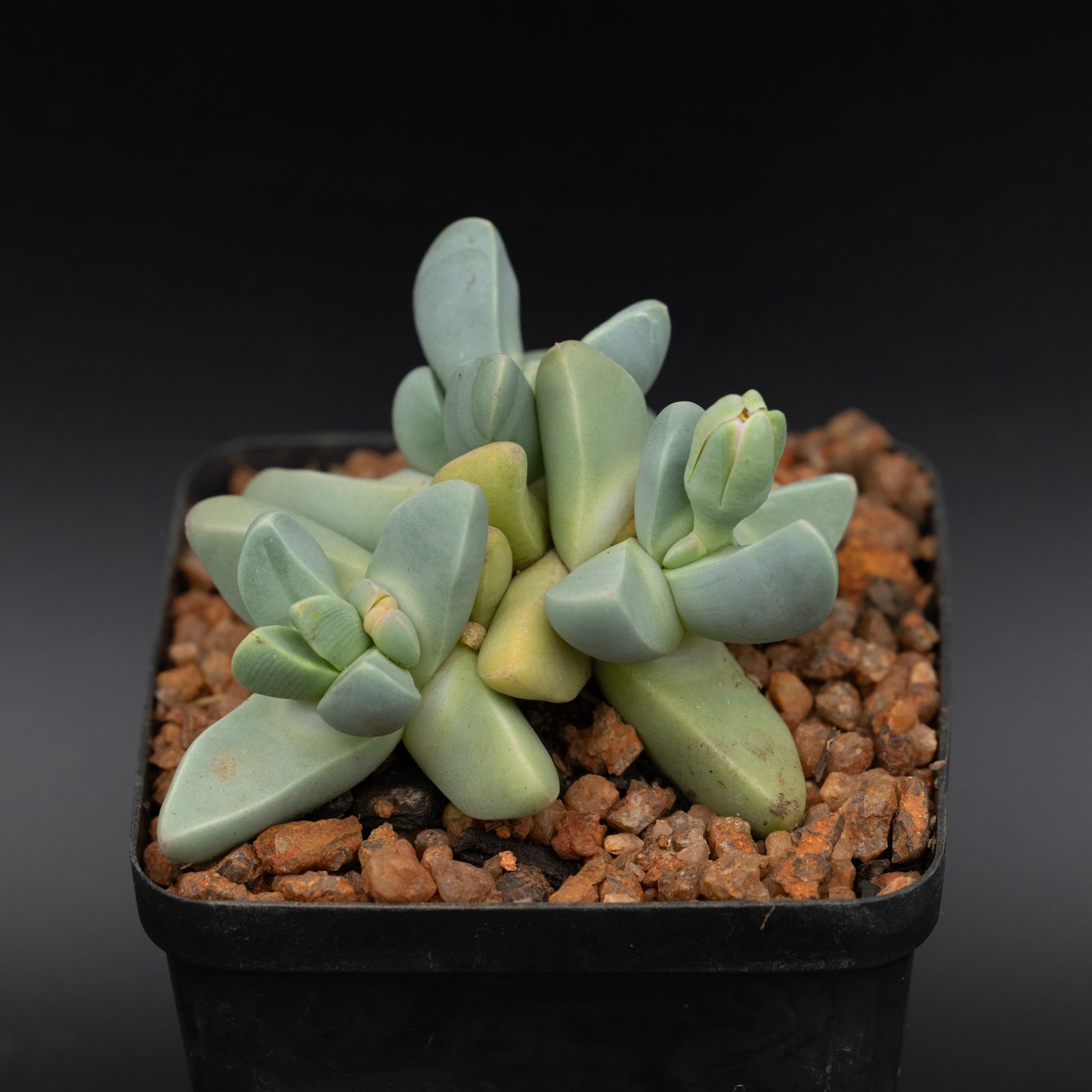 Dracophilus dealbatus is native to the arid regions of South Africa, specifically in areas with rocky, well-drained soils and high sunlight exposure. It has evolved to withstand long dry spells and harsh sunlight by developing a protective powdery coating on its leaves and a compact growth form.